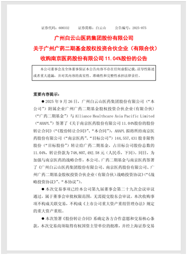 上证报中国证券网讯(记者 李五强)9月28日,白云山(600332)与南京医药(600713)同期发布公告,白云山旗下广州广药二期基金股权投资合伙企业(有限合伙)(以下简称“广药二期基金”)拟出资7.49亿元东谈主民币收购Alliance Healthcare Asia Pacific Limited(“AHAPL”)捏有的南京医药股份1.45亿股非限售股份,占南京医药总股份数的11.04%,转让价钱为5.18元/股。收购完成后,广药二期基金将成为南京医药第二大股东。