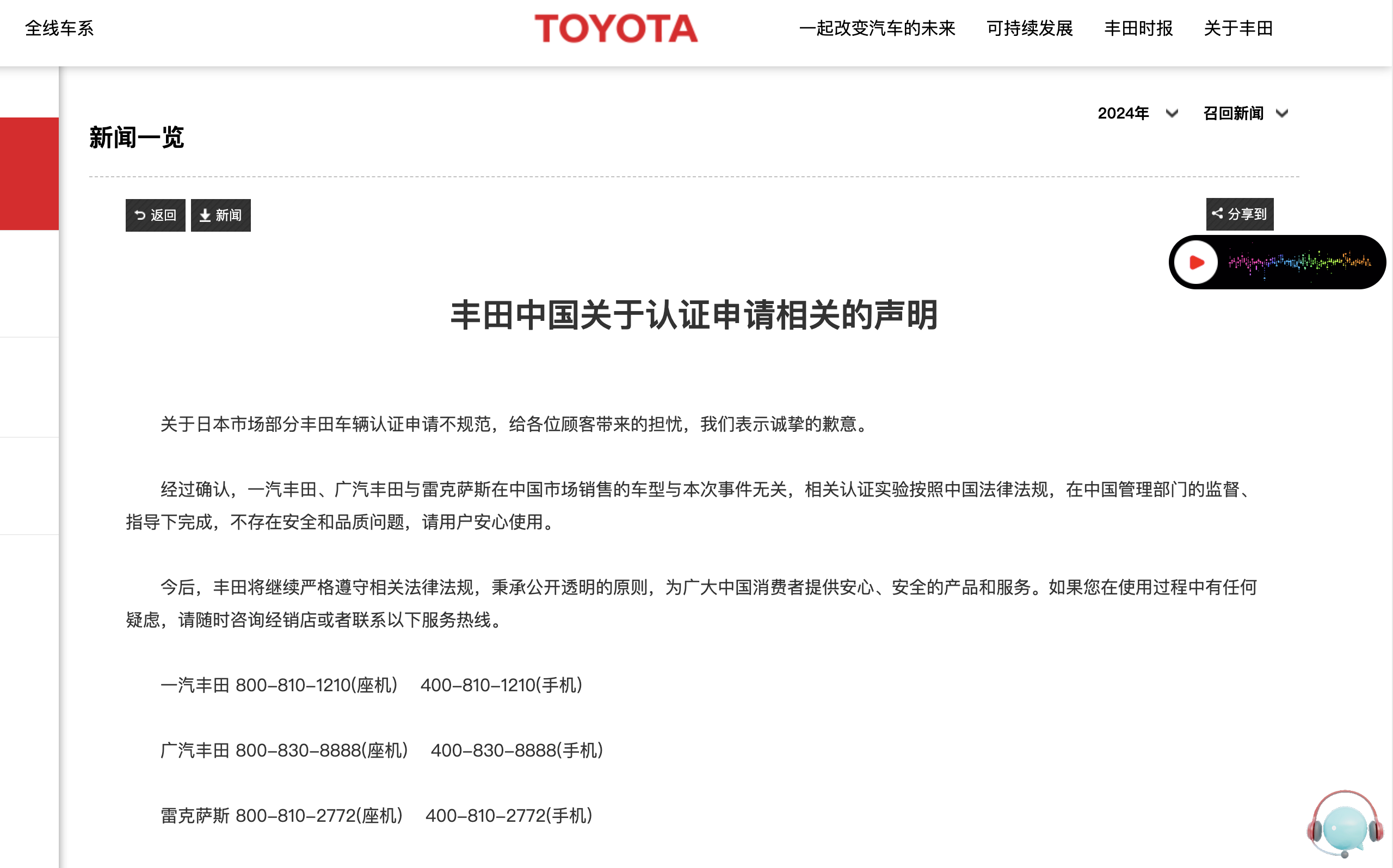 据广汽丰田官方微博,丰田中国6月3日就认证申讨教题发布声明称,就日本商场部分丰田车辆认证请求不圭表给顾主带来的担忧示意真诚的歉意;经过说明,一汽丰田、广汽丰田与雷克萨斯在中国商场销售的车型与本次事件无关,关联认证执行按照中轨则律礼貌,在中国处置部门的监督、携带下完成,不存在安全和品攻讦题。