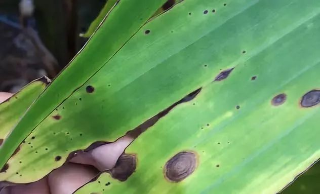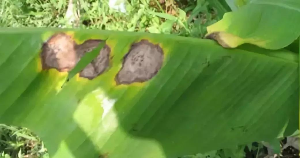 香蕉灰斑病:香蕉灰斑病由香蕉拟盘多毛孢引起。病斑中央灰白色,有彰着的齐心轮纹,周围具彰着的橙黄色晕圈。