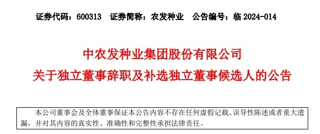 4月26日讯息,农发种业公告称,公司董事会近日收到平静董事王一鸣和周建如的离职恳求。