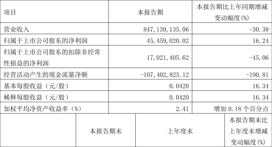 农发种业2024年一季度净利润4545.90万元 同比增长16.24%;