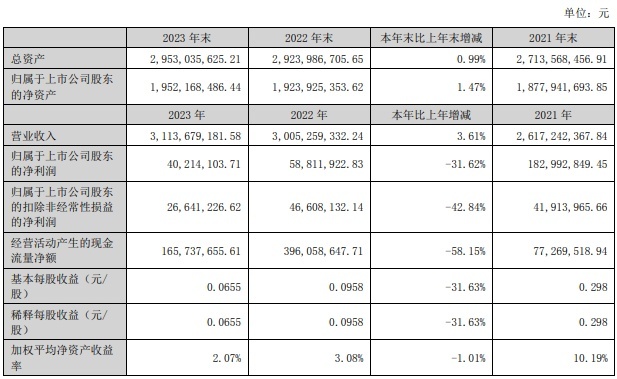 丰乐种业(000713)4月26日线路2023年年报。2023年,公司收场商业总收入31.14亿元,同比增长3.61%;归母净利润4021.41万元,同比着落31.62%;扣非净利润2664.12万元,同比着落42.84%;筹画动作产生的现款流量净额为1.66亿元,同比着落58.15%。