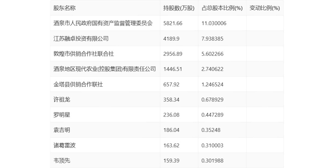 一季报泄露,2024年一季度末公司十大认知鼓动中,新进鼓动为酒泉市东谈主民政府国有钞票监督处置委员会、许祖龙、韦顶先,取代了上年末的酒泉市农业科学筹办院、胡志斌、中信证券股份有限公司。在具体握股比例上,酒泉地区当代农业(控股集团)有限牵扯公司握股有所着落。